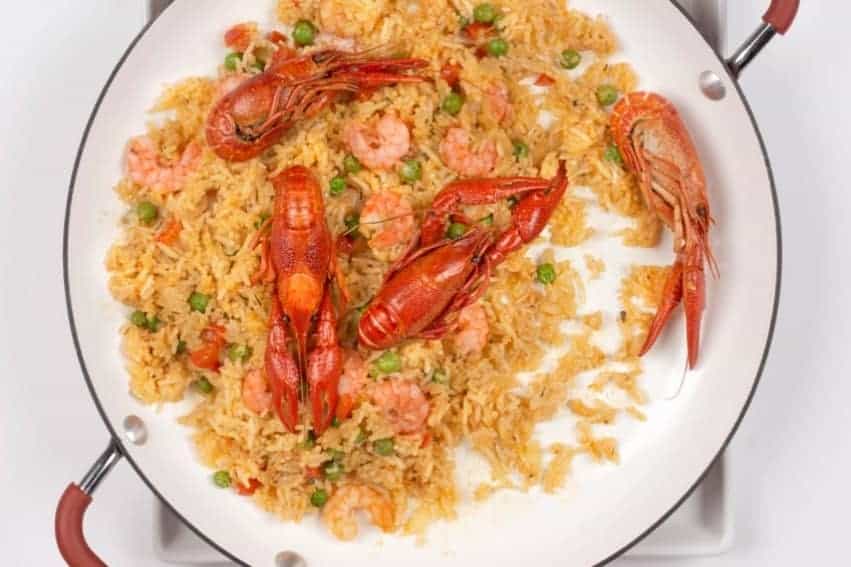 Add in remaining seafood. Cook on simmer until the rice is tender (about 20 minutes). Sprinkle the peas in about halfway through cooking. The paella may seem a little soupy when it first comes off the fire, but the rice will absorb the excess liquid.